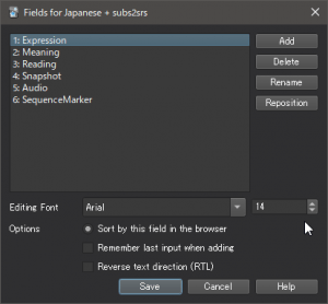 Then we just start adding new fields with the same names as the ones in Subs2SRS by clicking “Add”, giving the field a name such as “Snapshot”, and then hitting “OK”.